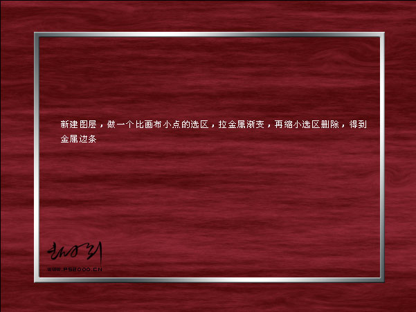 | 4、新建一個圖層,做一個比畫布稍小的選區,拉上金屬漸變色,然后再縮小選區刪除中間部分,效果如下圖。 |