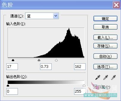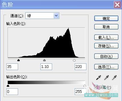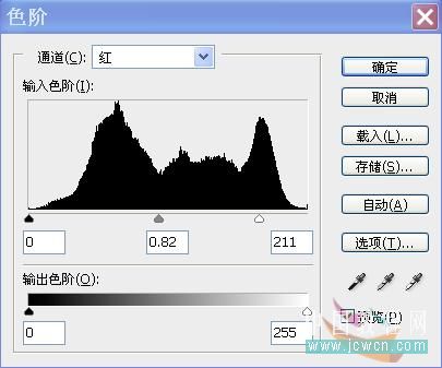 2、單擊“圖層”控制面板底部的“創建新的填充或調整圖層”命令按鈕,選擇“色階”命令,在打開的對話框中設置只對紅通道進行調整,參數設置(隨情況自定)如圖8所示。
