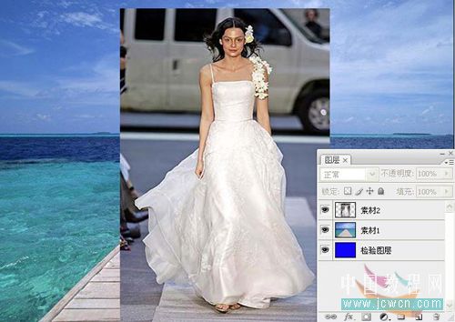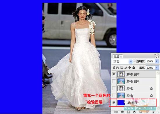 2、按ctrl+j鍵,分別將素材1和素材2復制生成“素材1副本”、“素材2副本”。將前景色設置為藍色(#0314fa),選擇“創建新圖層”得到一空白圖層,按“alt+delete”鍵填充為藍色。然后隱藏部分圖層,只顯示“檢驗圖層”。目的:檢驗摳圖的效果。
