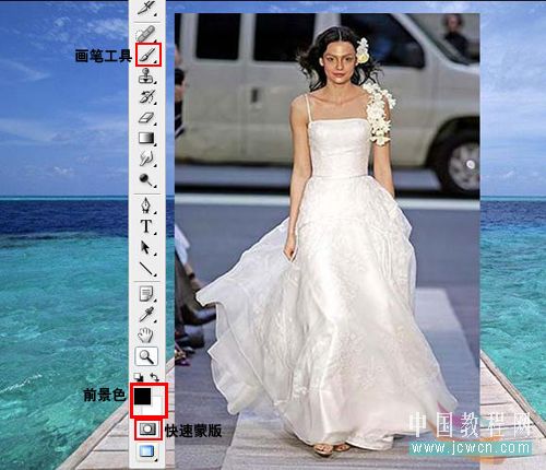 4、將前景色設置為:黑色。選擇畫筆工具,使用一種柔角、硬度為50%的畫筆在圖像窗口中沿人物涂抹創建蒙版區。如圖4所示: