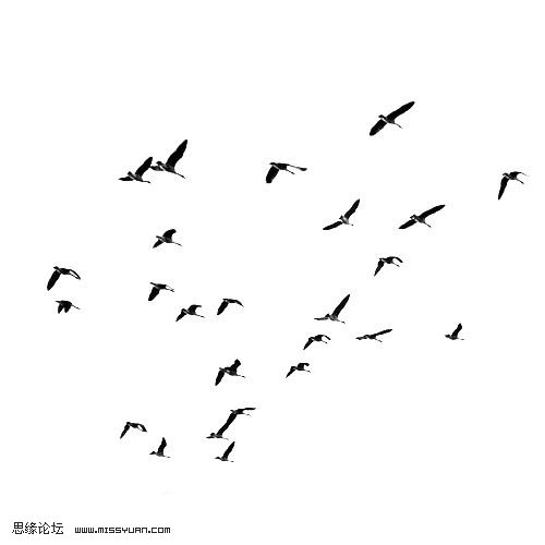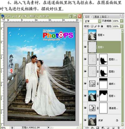6、拖入飛鳥素材,在通道面版里面把飛鳥摳出來,然后按ctrl + i反相操作,再適當擺好位置。