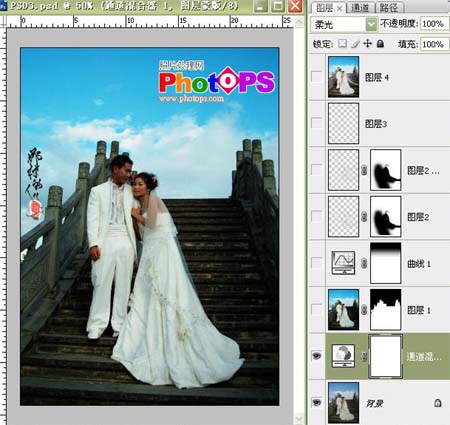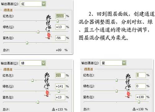 2、回到圖層面板,創建通道混合器調整圖層,參數設置如下圖,確定后把圖層混合模式改為“柔光”。
