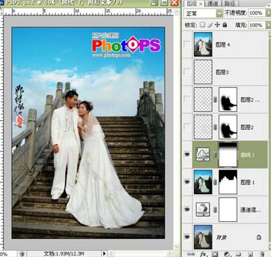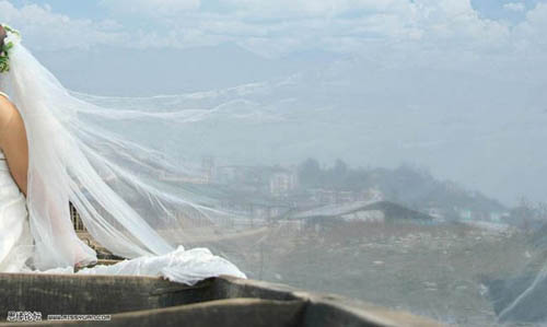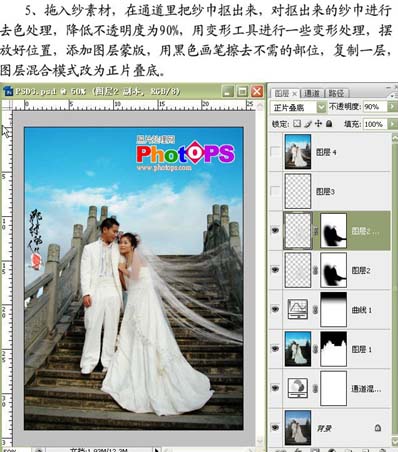 5、打開下圖紗紋素材,用通道摳圖法把紗紋部分摳出來,然后把摳出的紗巾去色,然后拖到剛才操作的婚片圖層里面,擺好位置,加上圖層蒙版用黑色畫筆擦掉不需要的部分,圖層不透明度改為:90%,復制一層圖層混合模式改為“正片疊底”。