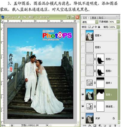 3、新建一個圖層,按ctrl + alt + shift + e蓋印圖層,圖層混合模式改為“濾色”,圖層不透明度改為:40%,加上圖層蒙版,點通道面板,按ctrl點藍副本通道調出選區,回到圖層面板填充黑色。