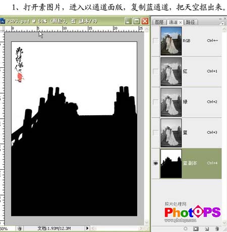 1、打開原圖素材,進入通道面板,把藍色通道復制一層,把天空部分摳出來。
