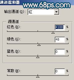 | 5、創(chuàng)建通道混合器調(diào)整圖層,參數(shù)設(shè)置如圖9,10,效果如圖11。 |