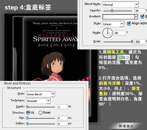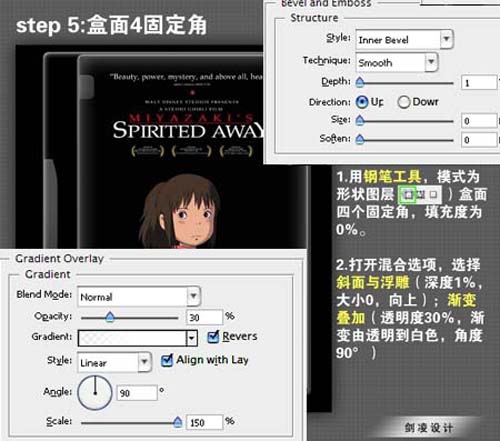 5、新建一個圖層,用鋼筆工具勾出盒面的四個固定角,填充黑色,然后把填充度改為:0%。雙擊圖層調出圖層樣式,選擇斜面與浮雕及漸變疊加。