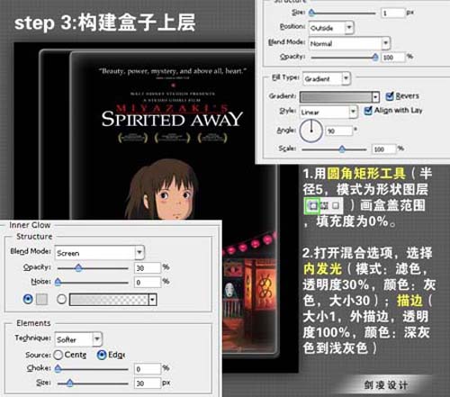 3、再用圓角矩形工具半徑為5,模式為形狀圖層,然后拉出海報差不多大小的圓角矩形,把填充度改為為:0%。雙擊圖層調出圖層樣式,設置內發光和描邊,參數設子如下圖。