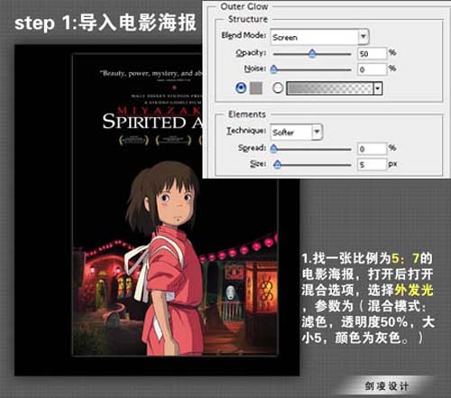 1、找一張比例為5:7的電影海報,打開后打開混合選項,選擇“外發光”,參數為(混合模式:濾色,透明度50%,大小5,顏色為灰色。)