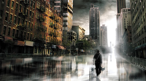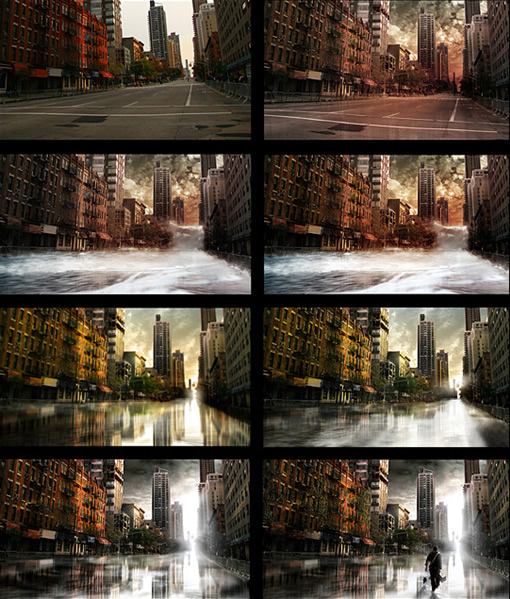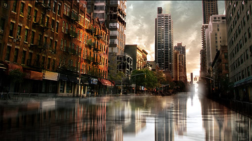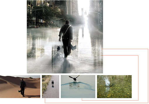 洪水-給城市里加水,這是一個復雜的過程,需要照顧到物體的倒影和反光。最后的效果是混合了一些河流、池塘等圖片。
