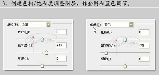 | 3、創(chuàng)建色相/飽和度調(diào)整圖層,參數(shù)及效果如下圖。 |