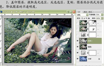 | 2、新建一個(gè)圖層,按ctrl + alt + shift + e蓋印圖層,按ctrl + alt + ~提取高光選區(qū),按ctrl + shift + i反選,按ctrl + j復(fù)制到新的圖層,然后把圖層混合模式改為“濾色”,圖層不透明度改為:72%。 |