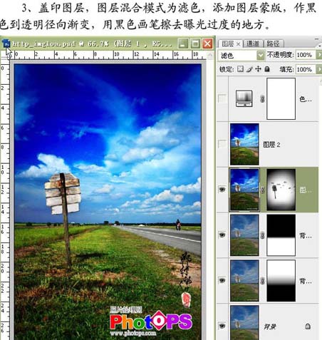 | 3、新建一個(gè)圖層,按ctrl + alt + shift + e蓋印圖層,圖層混合模式改為“濾色”。添加圖層蒙版,做黑色到透明徑向漸變,用黑色畫筆擦去曝光過度的地方。 |
