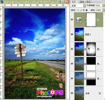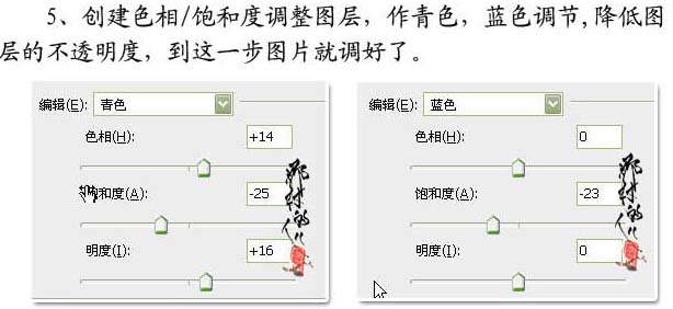 | 5、創(chuàng)建色相/飽和度調(diào)整圖層,做青色,藍(lán)色調(diào)節(jié),降低圖層的不透明度,到這一步背景就調(diào)好了。 |