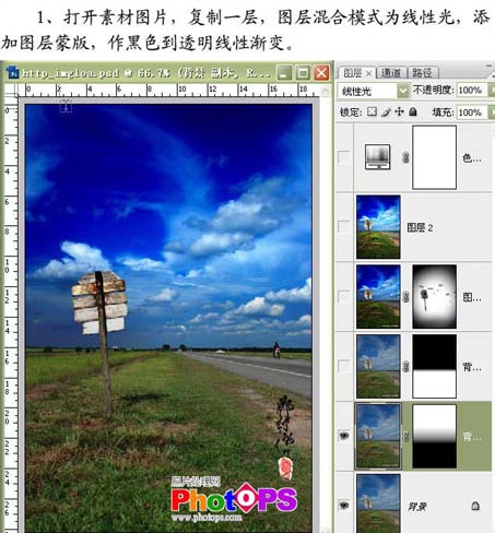 | 1、打開下面的背景素材,復(fù)制一層,圖層混合模式改為“線性光”,加上圖層蒙版,做黑色到透明的線性漸變。 |
