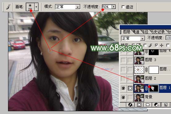 | 1、打開原圖素材,把背景圖層復制一層,然后再副本執行:濾鏡 > 模糊 > 高斯模糊,數值為3,確定后按住alt鍵再按圖層面板下面的蒙版按鈕,給圖層加上蒙版如圖1。這時你會發現圖片沒有任何變換,剛才模糊的圖片不見了,這個就是按住alt的用處(把蒙版直接填充了黑色)。 2、然后選擇白色畫筆,筆刷需要選擇柔邊的那種透明度為50%左右如圖2,然后在人物臉上,皮膚及衣服上有雜色的地方涂抹,給人物磨皮。這種磨皮方法是本人獨創的,之前的教程都有用過,不過這次詳細講解一下。涂抹的時候不要涂抹人物的輪廓部分確保不影響人物構造。其它模糊的地方在后面會處理。磨皮后有的地方會有色塊,后面會再磨次皮,也是用同樣的方法不過模糊的數值會大一點。這樣磨皮的方法非常自然快捷,用磨皮軟件很多時候會破壞人物的輪廓部分。準備下次再單獨寫個教程介紹這種磨皮方法。 |
