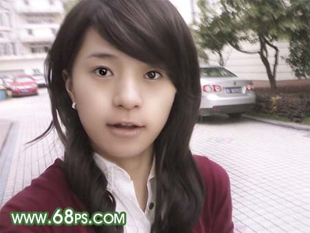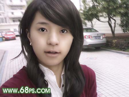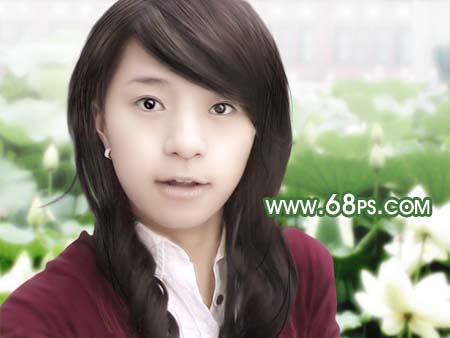 | 5、新建一個圖層,按ctrl + alt + ~調出高光選區,填充白色,圖層不透明度為:80%,效果如圖10,把照片調白了很多,不過原圖比較模糊。不過臉上調白后幾乎沒有什么雜色,證明之前的磨皮方法非常精細。 |