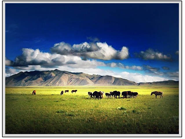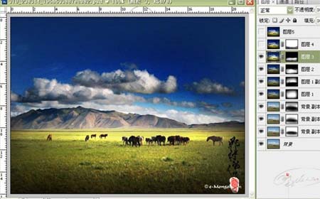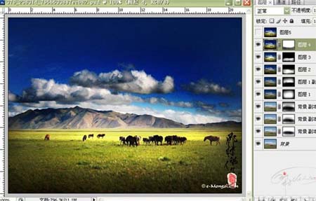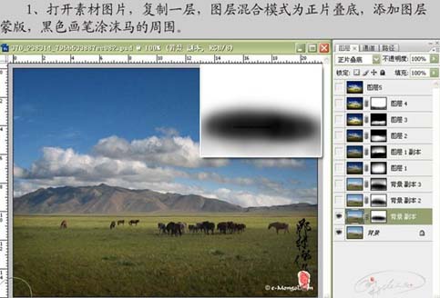 | 1、打開素材圖片,把背景圖層復(fù)制一層,圖層混合模式改為“正片疊底”,加上圖層蒙版,用黑色畫筆涂抹馬的周圍。 |
