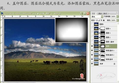 | 4、新建一個(gè)圖層,按ctrl + alt + shift + e蓋印圖層,圖層混合模式改為“柔光”,加上圖層蒙版用黑色畫筆涂抹四周。 |