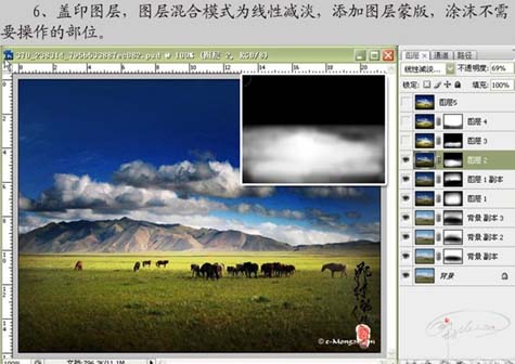 | 6、新建一個(gè)圖層,蓋印圖層,圖層混合模式改為“線性減淡”,加上圖層蒙版,用黑色畫筆涂抹不需要操作的部分。 |
