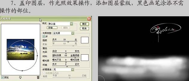 | 7、新建一個(gè)圖層,蓋印圖層,執(zhí)行:濾鏡 > 渲染 > 光照效果,參數(shù)設(shè)置如下圖,確定后加上圖層蒙版,用黑色畫筆擦掉不需要操作的部位。 |