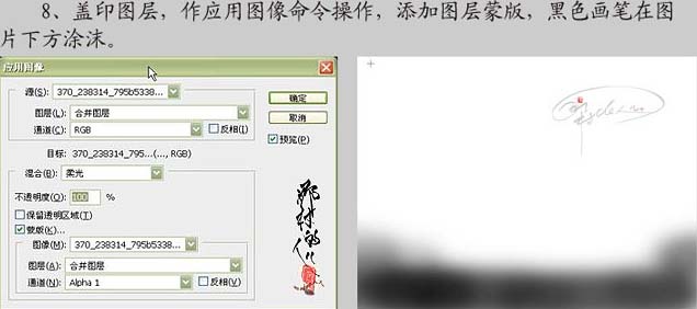 | 8、新建一個(gè)圖層,蓋印圖層,執(zhí)行:圖像 > 應(yīng)用圖像操作,參數(shù)設(shè)置如下圖,確定后加上圖層蒙版,用黑色畫筆在圖片下方涂抹。 |