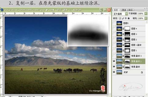 | 2、把剛才操作的圖層復(fù)制一層,在原先蒙版的基礎(chǔ)上繼續(xù)涂抹。 |