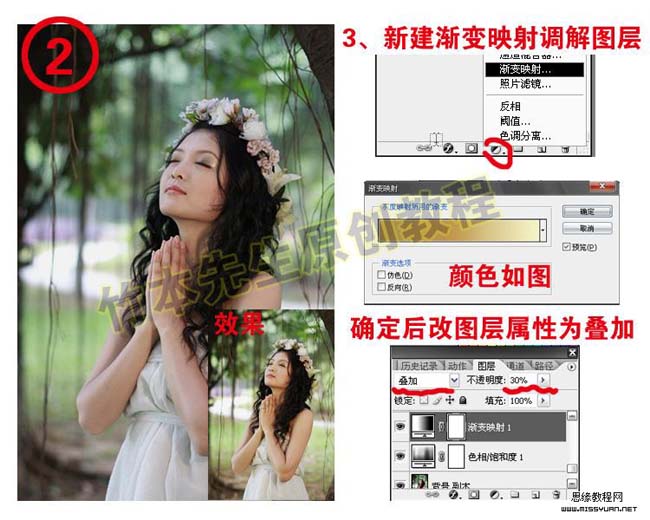 | 3、創建漸變映射調整圖層,參數設置如下圖,確定后把圖層混合模式改為“疊加”,圖層不透明度改為:30%。 |