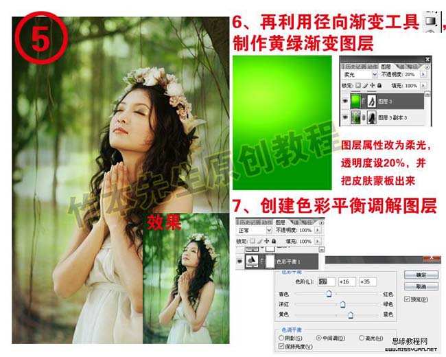 | 6、再利用徑向漸變工具做黃綠漸變圖層。然后把圖層混合模式改為“柔光”,圖層不透明度改為:20%,加上圖層蒙版把皮膚部分用黑色畫筆擦出來。 7、創建色彩平衡調整圖層,參數設置如下圖。 |