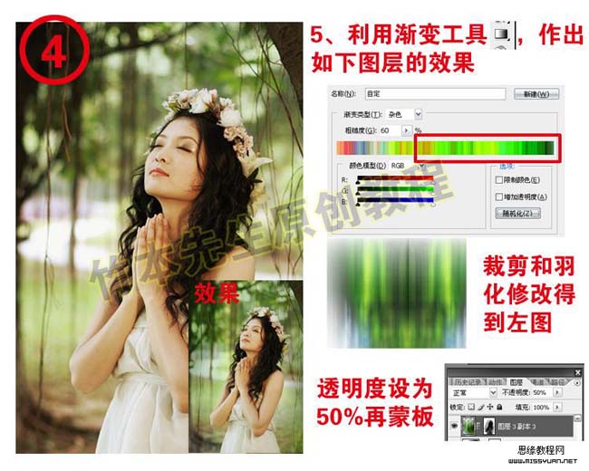 | 5、新建一個圖層選擇漸變工具做成下圖所示的效果,裁剪和羽化修改得到左圖效果。 |