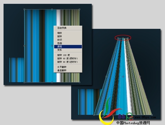 5、現在來創建三維效果。執行ctrl+t點右鍵—透視,點住上面兩角的節點左右平行移動,將它們集在一起,點住
