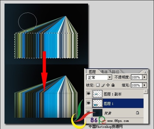 7、選擇側面矩形圖層,載入選區,添加蒙版,用黑色軟邊畫筆在延伸處畫上黑色,使物體與畫面結合,顯得更有深度。