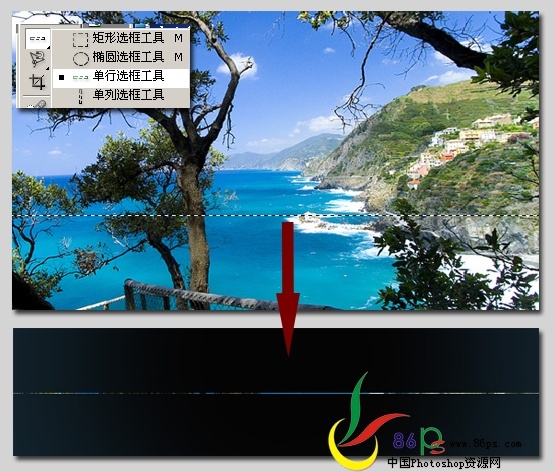 3、隨意打開一張圖片,用單行選框工具在上面點一下,ctrl+c復制,到新建的檔上ctrl+v粘貼,(或ctrl+j復制出來,