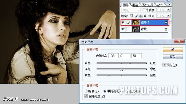 5.對“圖層1”進行“色彩平衡”調整(ctrl+b),參數如圖