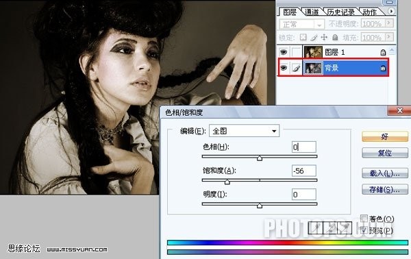 4.對“背景”圖層進行“色相/飽和度”調整(ctrl+u),參數如圖
