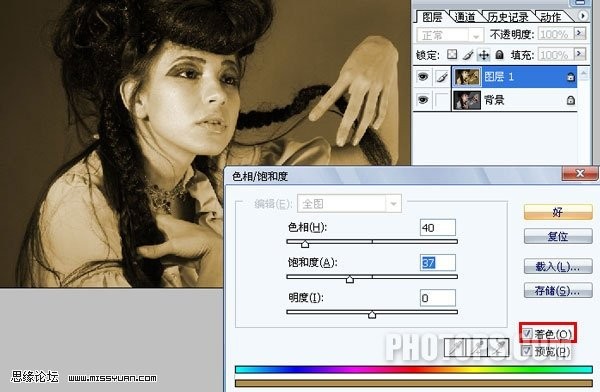 2.對"圖層1"做“色相/飽和度”調整(ctrl+u),“著色”前面打勾,參數如圖
