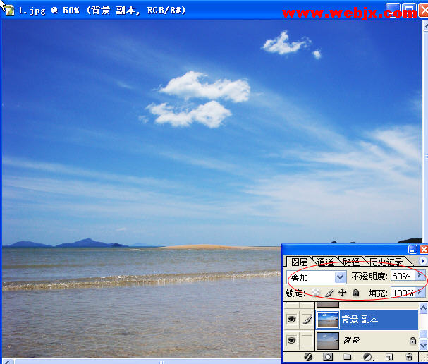 然后設置該圖層的模式為“疊加”用來加強色彩對比,之后設置不透明度為60%,效果如下:
