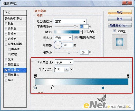 其中【漸變編輯器】中三個色標的顏色值依次是:#a6c2cd,#ffffff,#07709f。