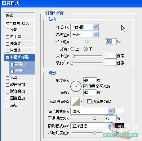 | 22、點圖層面板下面的“添加圖層樣式”按扭,選擇斜面和浮雕,設置如圖20。 |