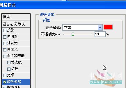 | 11、點圖層面板下面的“添加圖層樣式”按扭,選擇顏色疊加,設置如圖8。 |