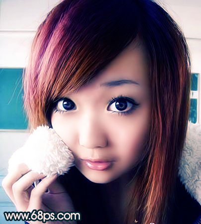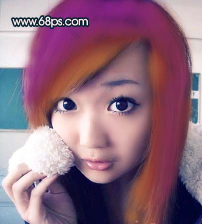 | 6、新建一個圖層,選擇畫筆工具,選取適當的顏色,把人物頭發涂出圖13所示的色塊,然后把圖層混合模式改為“柔光”,效果如圖14。 |