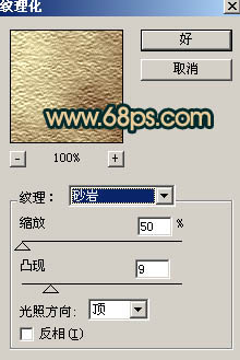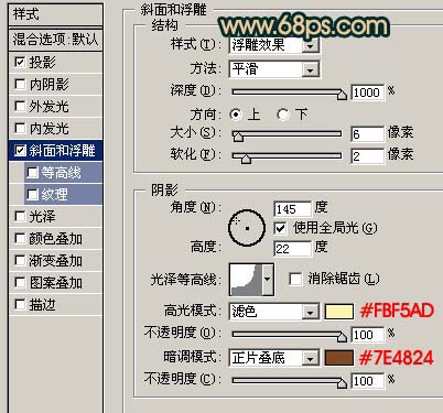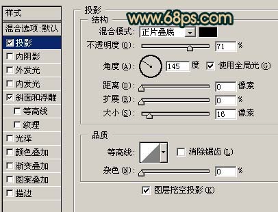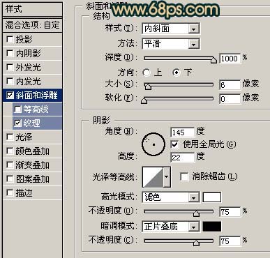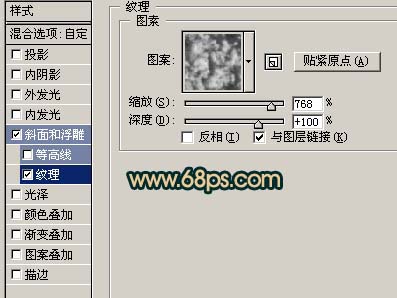 5、雙擊紋理圖層縮略圖調(diào)出圖層樣式,分別設(shè)置投影和斜面/浮雕,參數(shù)設(shè)置如圖7,8,效果如圖9。