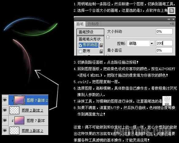 1、新建一個大小適當的文件,背景填充黑色。用鋼筆工具繪制一條路徑,然后新建一個圖層,選擇畫筆工具。