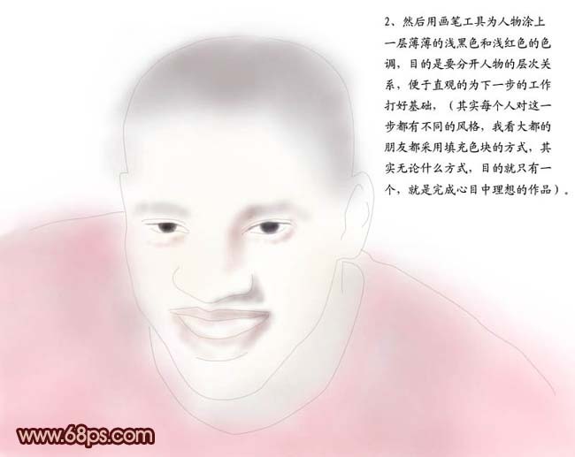 2、然后用畫筆工具為人物涂上一層薄薄的淺黑色和淺紅色的色調,目的是要分開人物的層次關系,便于直觀的為下一步工作打好基礎。