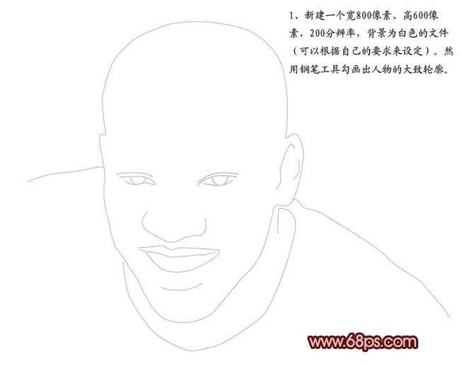 1、新建一個800 * 600像素的,200分辨率的文件,背景填充白色。然后用鋼筆工具勾畫出人物的大致輪廓。