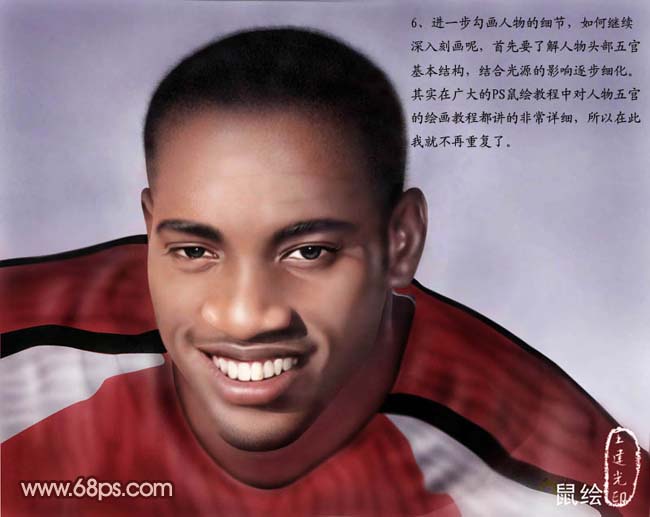 6、進一步勾畫人物細節,如何繼續深入刻畫呢,首先要了解人物頭部五官基本結構,結合光源的影響逐步細化,其實在廣大ps鼠繪教程中對人物五官的繪畫教程都講得非常詳細,所以再次就不再重復了。