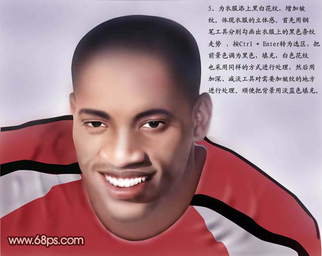 5、為衣服添上上黑白花紋,增加皺紋,體現衣服的立體感。首先用鋼筆工具分別勾畫出衣服上的黑色條紋走勢,按ctrl + enter轉為選區,把前景色調設為黑色,填充白色花紋也采用同樣的方式進行處理,然后用加深,減淡工具對需要加皺紋的地方進行處理,順便把背景用淡藍色填充。