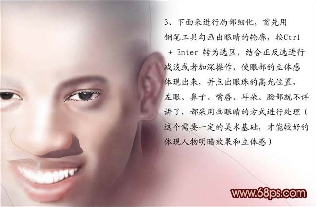 3、下面來進行局部細化,首先用鋼筆工具勾畫眼睛輪廓,按ctrl + enter轉為選區,結合正反選進行減淡或者加深操作,使眼部的立體感體現出來,并點出眼珠的高光位置,左眼、鼻子、嘴唇、耳朵、臉部就不詳講了,都采用畫眼睛的方式進行處理。