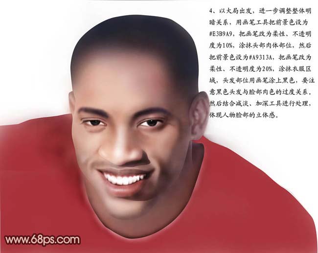 4、以大局出發,進一步調整整體明暗關系,用畫筆工具把前景設為:#e3b9a9,把畫筆改為柔性,不透明度為:10%,涂抹頭部肉體部位,然后把前景設為:#a9313a,把畫筆改為柔性,不透明度改為:20%,涂抹衣服區域,頭發部位用畫筆涂上黑色,要注意黑色頭發與臉部肉色的過度關系。然后結合減淡,加深工具進行處理,體現人物臉部的立體感。