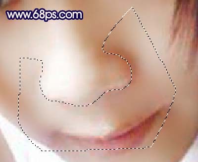 4、新建一個圖層,蓋印圖層,用鋼筆工具把鼻子的主要輪廓部分勾出來,按ctrl + enter轉為選區,選擇加深工具把邊緣部分加深一點,效果如圖6。